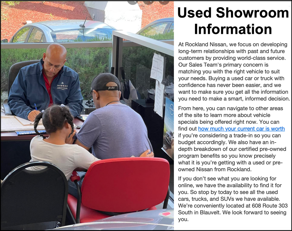 Visit Rockland Nissan in Blauvelt, NY to test-drive your next used car today and experience why so many shoppers choose us for the best selection, pricing, and customer service on pre-owned Nissan vehicles in the region.